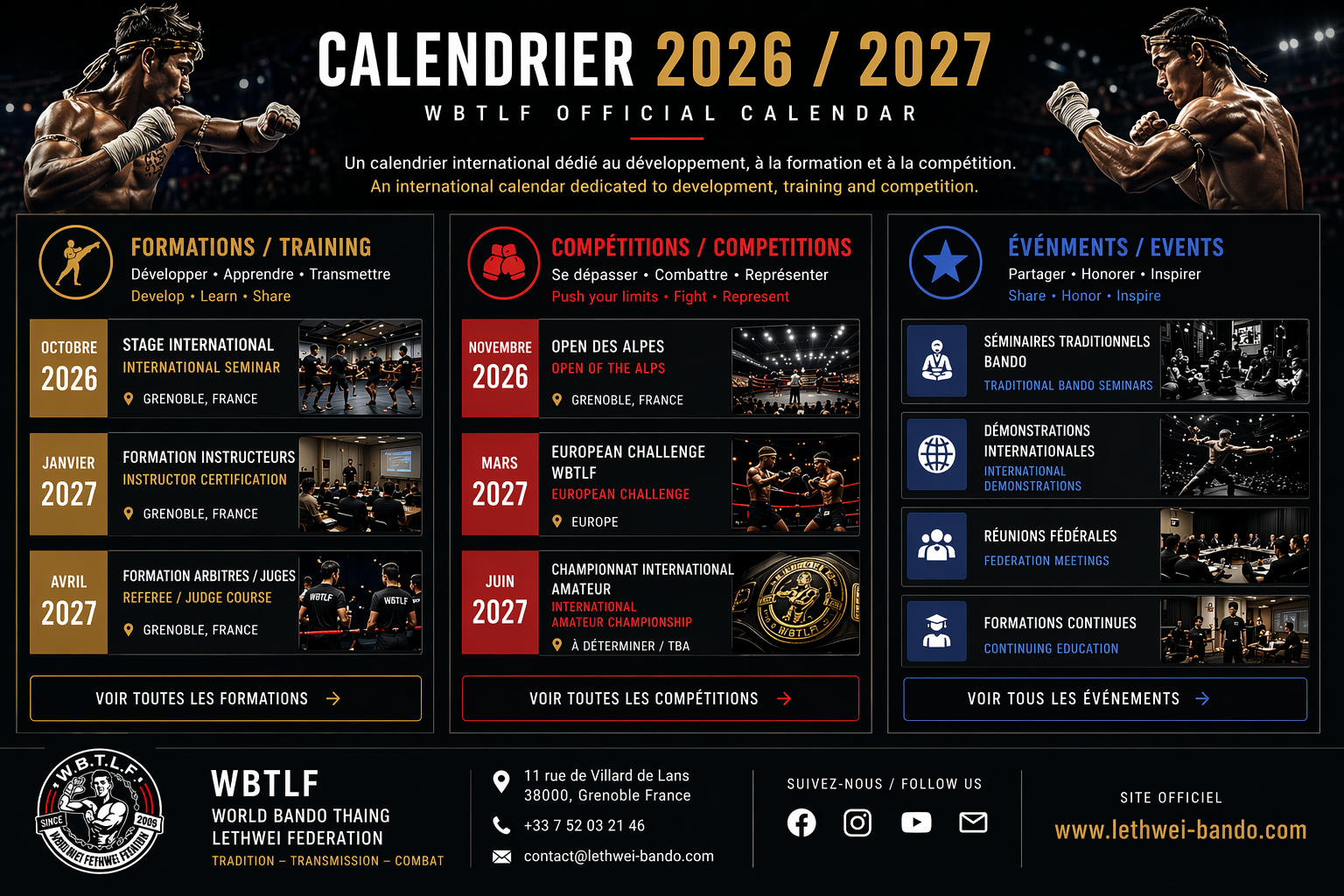 Depuis notre création en 2005, la Fédération Internationale de Bando, Lethwei & Thaing s'engage à promouvoir les arts martiaux traditionnels et modernes à travers le monde. Nous offrons des programmes d'entraînement de haute qualité, des événements sportifs passionnants et une communauté dynamique de pratiquants passionnés.